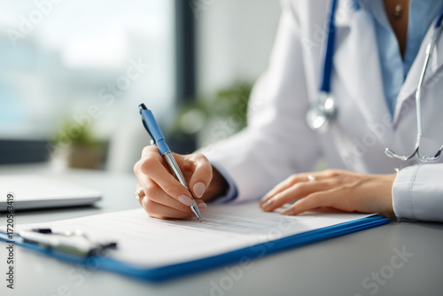Close-up of a Female Doctor's Hand Writing a Medical Report on a Clipboard
