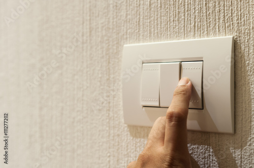 Closeup of A finger is turning on a lighting switch on wallpaper background with copyspce.