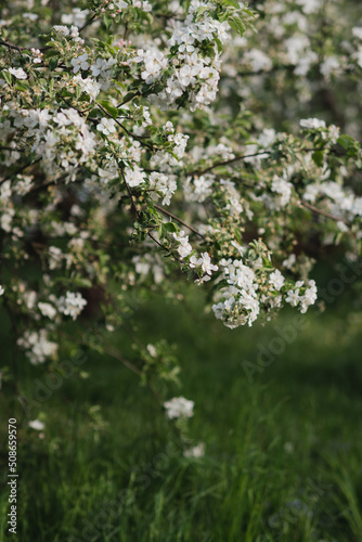 Closeup of a fruit tree with white blossom and green grass in spring. Beautiful nature background with copy space. Freshness, art, inspiration, beauty concept.