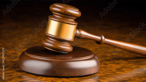 Close-up of a gavel resting on a wooden bench in a courtroom, symbolizing justice, legal decisions, and courtroom authority. Concept of law, order, and judicial system.