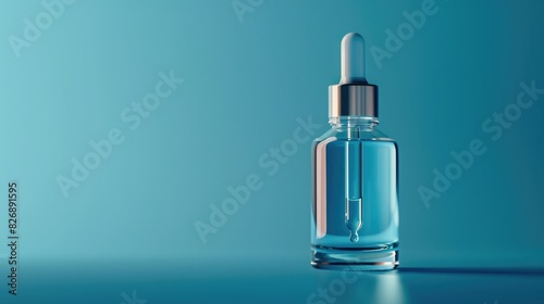 Close-up of a glass dropper bottle with clear liquid on a blue background. Perfect for skincare, beauty, or pharmaceutical concepts.