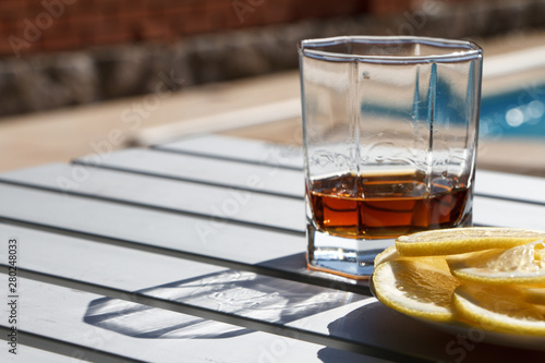 Close-up of a glass faceted glass with a strong alcoholic drink standing on a sun lounger by the pool and near a lemon slice