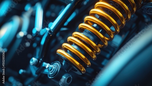 shock, absorber, motorcycle, coil, spring, gold, blue, metal, machine, part, vehicle, automotive, engineering, technology, detail, closeup, macro, photo, component, industrial, mechanic, hardware, suspension, system, motorbike, transport, powerful, stylish, precision, quality, chrome, shiny, bright, elegant, strong, accurateness, performance, speed, power, luxury, durability