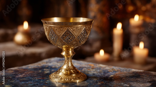 Close-up of a golden Orthodox chalice on an altar, ornate engravings catching reflections of candle flames