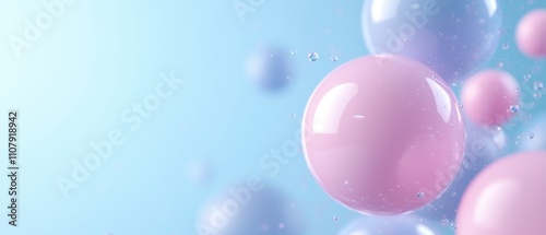 Close-up of a group of pink and blue spheres floating in the air. the spheres are of different sizes and shapes, with some being larger and others smaller.