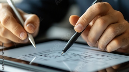 hand, finger, tablet, stylus, pen, drawing, vignetting, design, creative, digital, technology, art, graphic, work, business, office, workspace, closeup, sharpened, professional, modern, illustration, web, interface, concept, idea, brainstorming, plan, project, strategy, innovation, future, contraption, screen, display, line, black, white, grey, closeup, detail, texture, macro
