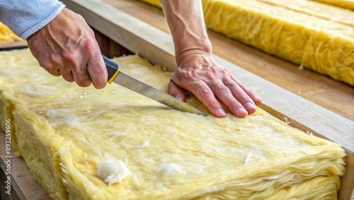 Close-up of a hand holding a knife carefully cutting through a thick slab of thermal insulation made from glass wool fibers.
