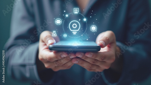 Close-up of a hand holding a smartphone with a digital interface, surrounded by holographic and futuristic technology symbols