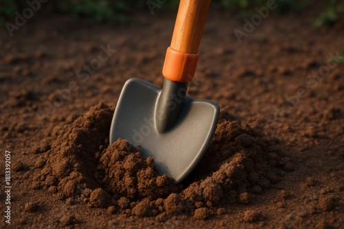 shovel, trowel, digging, earth, dirtied, dirt, ground, gardening, garden, cultivate, plant, planting, grow, agriculture, farm, farming, tool, implement, manual, labor, work, nature, natural, brown, fertile, rich, fresh, newly, hole, mound, pile, dug, prepare, preparation, spring, summer, season, environment, healthy, organic, sustainable, hobby, activity, home, backyard, yard, rural, urban