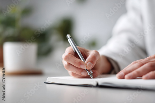 Closeup of a hand writing in a notebook with a pen. Represents creativity, planning, journaling, notetaking, and organization. Ideal for business, education, and lifestyle themes.