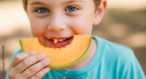 children, children, boy, girl, happy, smile, eating, melon, cantaloupe, fruit, healthy snack, closeup, portrait, face, joy, fun, summer, sun, sunlight, natural light, picnic, food, healthy, sweet, juicy, fresh, delicious, childhood, innocence, cute, adorable, messy, green eye, brown hair, orange fruit, yellow fruit, bite, enjoying, leisure, authentic, bright, vibrant, bokeh, photo