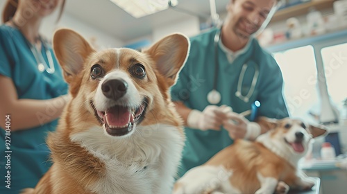 Close-up of a happy dog being examined by a veterinarian in a clinic.