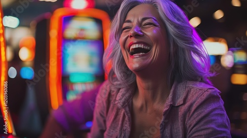 woman, mature woman, laughing, happy, cheerful, excited, casino, slot machine, gambling, nightlife, entertainment, leisure, joy, goggles, colourful, vibrant, neon, light, fun, night, blithe, closeup, portrait, positive, senior citizen, middle-aged, red lipstick, casual clothes, celebration, luck, success, enjoyment, amusement, opportunity, illuminated, outdoors, indoor