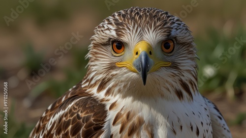 hawk, bird, animal, feather, eye, beak, wildlife, nature, bird of prey, predatory, look, intense, sharp, sharpened, wing, closeup, head, portrait, brown, white, yellow, green, blurry, background, feathery, talon, wild, outdoors, photo, birding, natural, beautiful, majestic, strong, powerful, sharpness, predator
