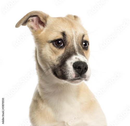 Close-up of a Husky Boxer Mixed-breed puppy, 3 months old