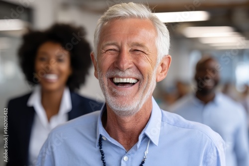 Close-up of a joyful mature businessman, with a wide, genuine smile, with diverse colleagues in the blurred background, representing leadership and positive work environment.