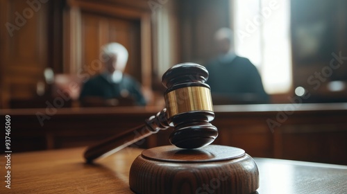 Close-up of a judge's gavel on a wooden block, blurred judge in the background, courtroom setting