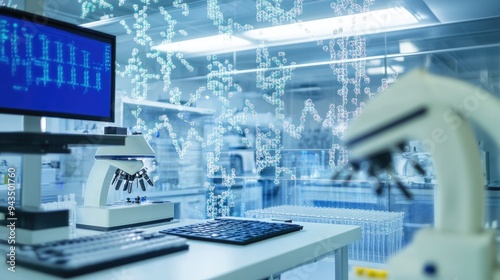 Close-up of a laboratory microscope beside a digital DNA strand, representing cutting-edge research in genetics and biotechnology..