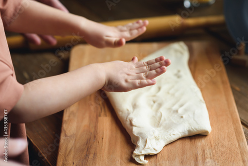 Close-up of a little girl's hand rolling out the dough. Mother teaches preschool girl to cook baked goods
