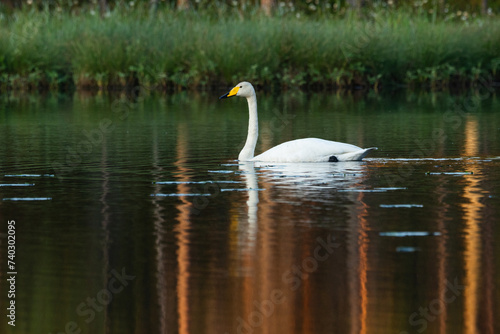 Closeup of a lonely Whooper swan swimming on a calm lake on a summer morning near Kuusamo, Northern Finland