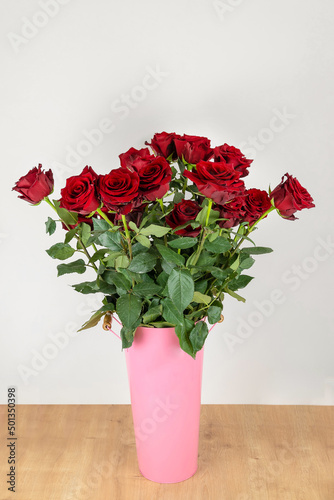 Close-up of a lot of red roses in a tin vase with handles on a wooden table on a neutral background. Vertical photo
