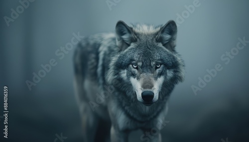 Close-up of a majestic wolf in a misty forest. The wolf's piercing eyes and thick fur create a mysterious and captivating scene.