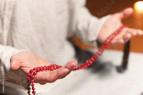 close-up of a male practitioner's hand sitting in lotus position in a dark meditation room with a rosary in his hands