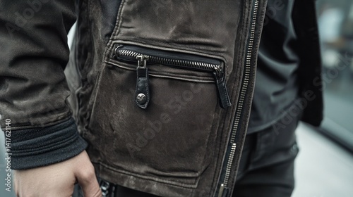 jacket, leather, clothing, fashion, apparel, style, menswear, texture, detail, design, zip, pocket, material, garment, dark, brown, grey, vintage, worn, distressed, fabric, sleeve, man, arm, hand, stylish, trendy, wear, attire, outerwear, gear, look, outfit, ensemble, piece, article