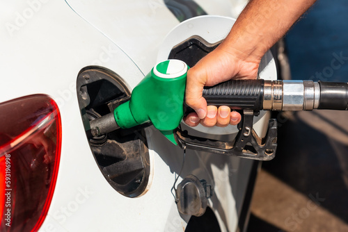 Close-up of a man's hand with the gun refueling gasoline or diesel fuel in a white car. Concept of transportation, energy crisis, oil crisis. Full tank in the midst of a price crisis at the gas pump