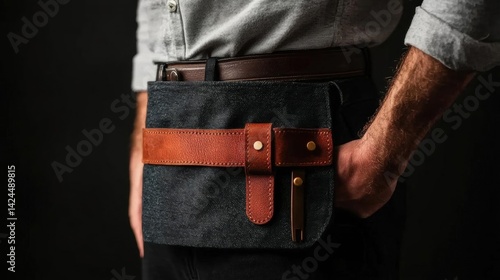 man, lower, body, waist, wearing, dark, blue, denim, fanny, pack, brown, leather, belt, metal, buckle, grey, shirt, background, black, making, racked, mood, casual attire, masculine, photo, diversity