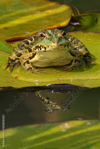 Close-up of a marsh frog sitting on a lily pad