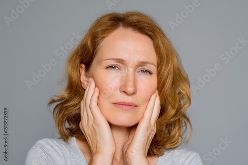 Close-up of a mature woman touching her face in discomfort, possibly indicating skin sensitivity, jaw tension, or facial discomfort. Suitable for health, skincare, aging, and wellness campaigns