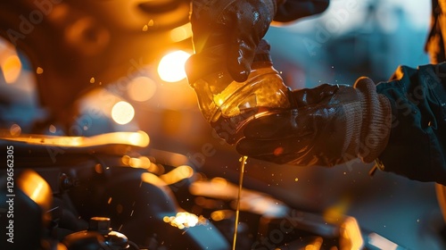 Closeup of a mechanic pouring to changing oil to car engine in a workshop. AI generated image
