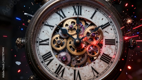 close-up of a mechanical clock exploding into fragments with gears shards and glowing