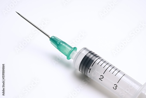 Close-up of a medical syringe with needle and measurement markings on a white background.