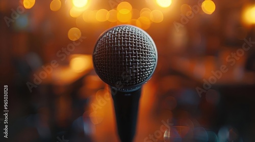 Close-up of a microphone against a blurred background, perfect for music, performance, or podcast themes.