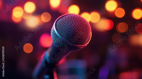 microphone, closeup, vibrant, red, blue, light, sharpened, sharp, blurred, soft, illumination, invitation, presence, acoustic, stage, sound, performance, music, concert, festival, celebration, christmas, new year's eve, easter, 4th july, halloween, warmth, energy, excitement, intensity, passion, dynamism, modernity, technology, innovation, creativity, spotlight, attention, engagement, communication