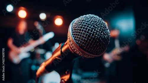 Close-up of a microphone on stage during a live music performance at night in an intimate venue
