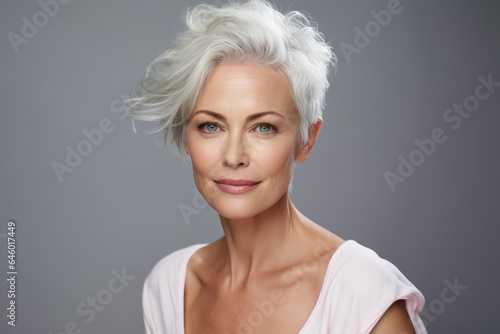 specialist, grey, hair, white, shirt, background, closeup, professional, fashion, style, chic, contemporary, beauty, trendy, colours, design, elegance, radiant, sophistication, attire, expertise, character, contrast, casual attire, pose, modern, generative, ai