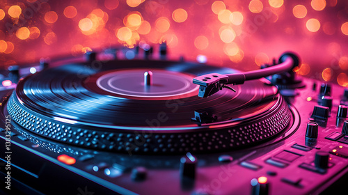 Close-up of a modern DJ turntable with a black vinyl record spinning smoothly on it. Suitable for marketing or business purposes