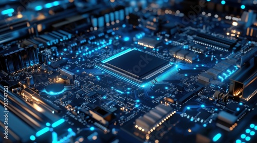 Close-up of a modern microchip on a circuit board with vibrant blue lights and intricate details, showcasing advanced technology.