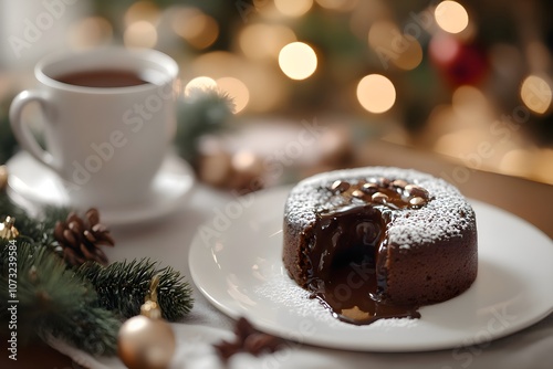 Close-up of a Moelleux au Chocolat, chocolate cake, with molten chocolate oozing onto a white plate on a Christmas-decorated coffee table. In the background, a cozy, festive apartment