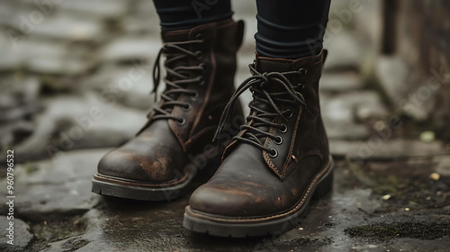 Closeup of a pair of brown leather boots with laces on a stone path.