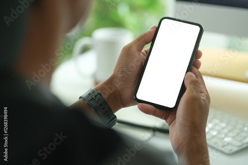 Close-up of a person holding a smartphone with a blank screen, ideal for showcasing mobile app designs, user interfaces, or digital services.