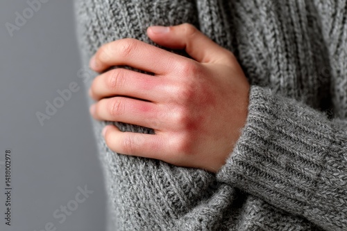 hand, redness, rash, irritation, skin, concern, medicals, health, wellness, sweater, knitwear, clothing, textile, texture, grey, background, closeup, detail, soft, comfortable, fabric, wool, winter, cold, season, apparel, arm, person, care, problem, allergy, reaction, condition, dermatology, treatment, therapy
