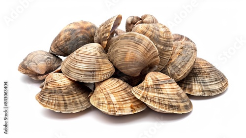 Close-up of a pile of fresh clams. The image captures the natural textures and colors of the clams in a simple, minimalistic style. Ideal for culinary or marine-themed projects. AI