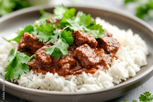 Close-up of a plate of beef curry with steamed rice, garnished with fresh cilantro clean and professional composition, copy space, natural color, minimalism, stock photography