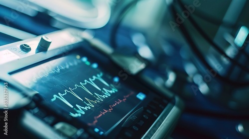Close-up of a portable ECG machine in use, detailed readout of cardiac activity, precision medical technology