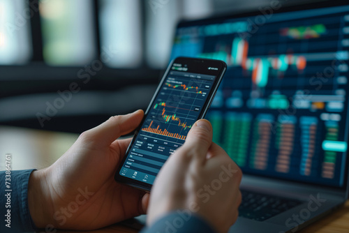Close-up of a professional analyzing financial statistics on a smartphone synchronized with a laptop screen.