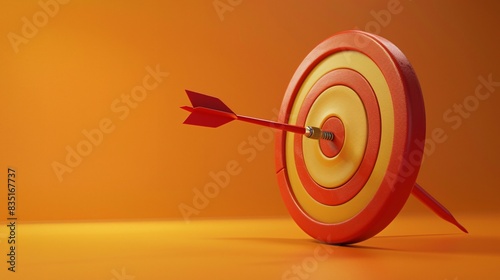 Close-up of a red and yellow dartboard with an arrow hitting the bullseye. Concept of accuracy, success, and focus against an orange background. 3D Illustration.